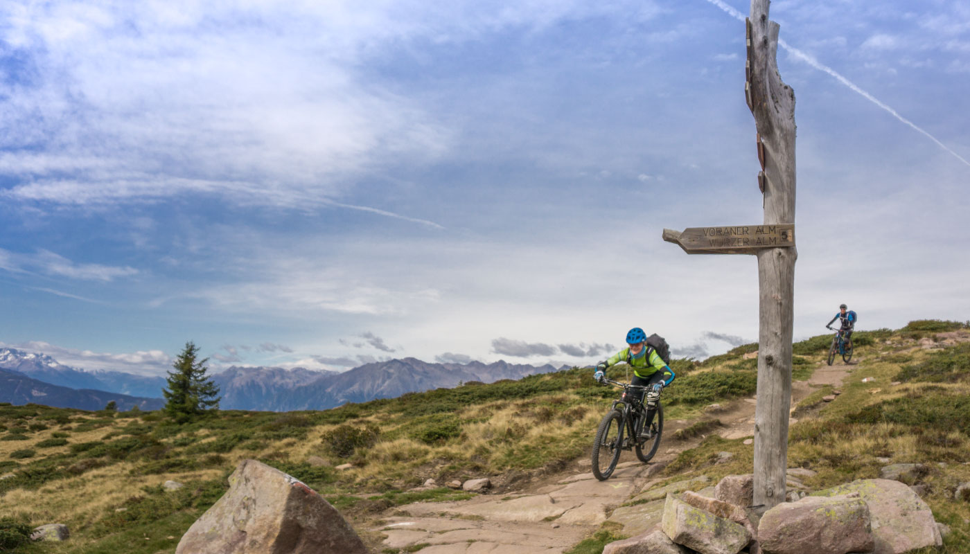 Kaum warmgefahren, gibt's schon zwei kurze Trailabschnitte, welche die Tour charakterisieren. Flow, dann Steinplatten und Wurzeln. Es geht vorbei an der Meranerhütte und bald auf einem gut fahrbaren Trail kurz steil bergauf bis zum Kreuzjöchl.