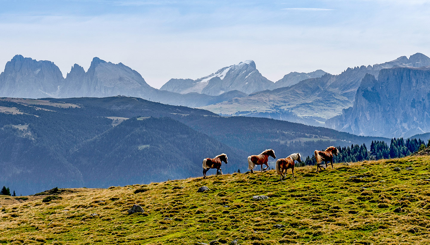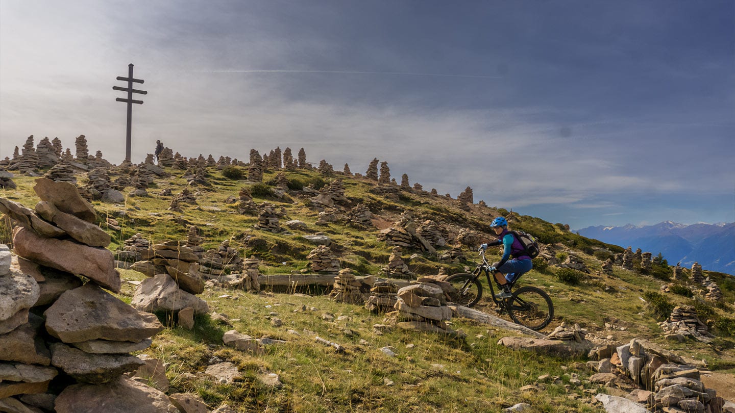 Oben angekommen, folgt die Route nun dem Europäischen Fernwanderweg E5 über den Grat zwischen Etschtal und Sarntal. Auf den typischen, von Pferden getretenen Haflinger Trails erreicht man mit einigen kurzen Gegenanstiegen die bekannten "Stoanernen Mandln". Um diese große Ansammlung von Steinskulpturen ranken sich verschiedenste Geschichten - hier möge sich aber jeder seinen eigenen Reim machen.