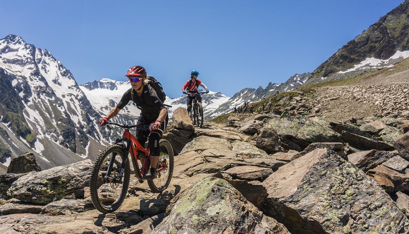 Wir gleiten hoch bis 2.620 m. Links blicken wir auf den Rettenbach Gletscher und unter uns riden Biker genüsslich gegen Tal.